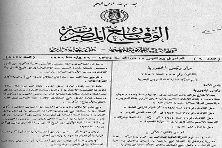 مادة ١: تؤمم الشركة العالمية لقناة السويس البحرية شركة مساهمة مصرية، وينتقل إلى الدولة جميع ما لها من أموال وحقوق وما عليها من التزامات، وتحل جميع الهيئات واللجان القائمة حالياً على إداراتها، ويعوض المساهمون وحملة حصص التأسيس عما يملكونه من أسهم وحصص بقيمتها، مقدرة بحسب سعر الإقفال السابق على تاريخ العمل بهذا القانون فى بورصة الأوراق المالية بباريس، ويتم دفع هذا التعويض بعد إتمام استلام الدولة لجميع أموال وممتلكات الشركة المؤممة.