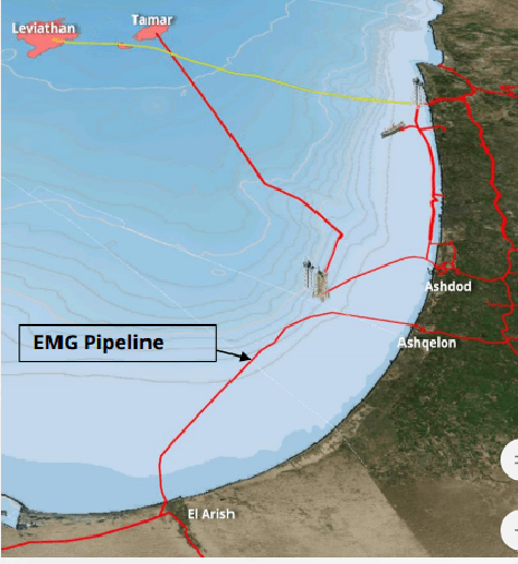 خريطة شركة ديليك الإسرائيلية تظهر مسار الغاز من حقلي تمار وليفايثان في إسرائيل إلى عسقلان الإسرائيلية ومنها إلى العريش المصرية
