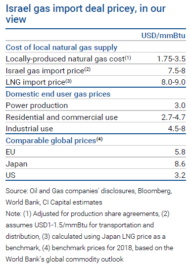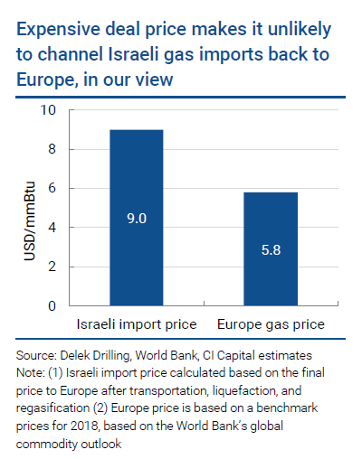 يتضمن التقرير تحليلًا مفصلًا لصفقة استيراد الغاز الإسرائيلي، وجاء فيه بالنص أن السعر الذي ستحصل به مصر على الغاز الإسرائيلي «مكلّف pricey». مضيفًا أن «القيمة التقديرية للاتفاق وهي 15 مليار دولار…مقابل 64 مليار متر مكعب ستترجم إلى سعر 6.5 دولار لكل وحدة حرارية وسُتدفع مباشرة إلى ديليك للحفر ونوبل إنيرجي وحدهما، بخلاف نفقات النقل والتوزيع المطلوبة لتوصيل الغاز إلى المستخدم النهائي».