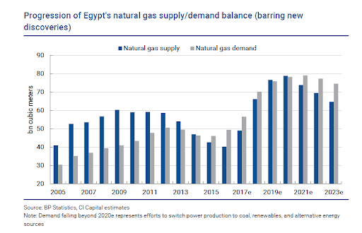 ففي يوم 31 يوليو 2018، تلقى محمد شعيب، الرئيس التنفيذي لغاز الشرق، تقريرًا بالإنجليزية من إعداد بنك الاستثمار «سي آي كابيتال» يحمل عنوان «مستقبل الغاز الطبيعي في مصر: تطورات القطاع تعيد التأكيد على حدوث عجز على المدى الطويل».