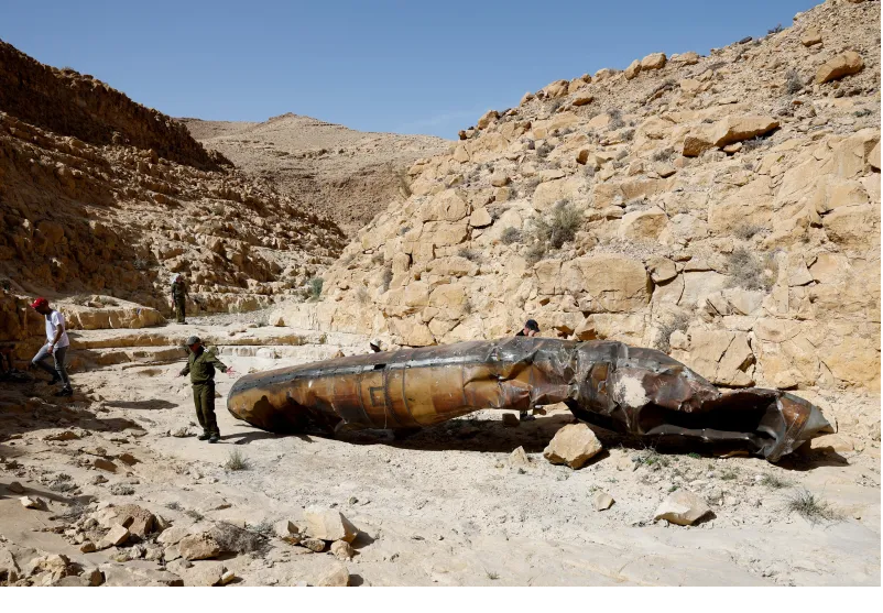 أفراد عسكريون إسرائيليون يتفقدون ما يبدو أنه بقايا صاروخ باليستي إيراني بالقرب من عراد، إسرائيل، أبريل 2024- أمير كوهين / رويترز