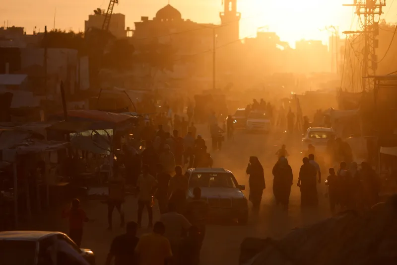 فلسطينيون يسيرون وسط المنازل التي دمرتها الغارات الإسرائيلية، غزة، مايو 2024