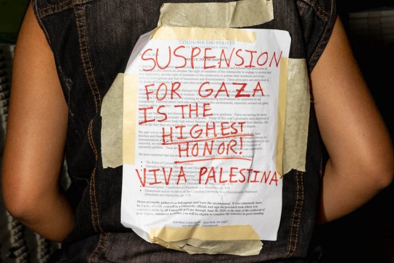 متظاهر يرتدي تحذيرًا ؤمن الجامعة مغطى بدعم للفلسطينيين غزة في جامعة كولومبيا في مدينة نيويورك.