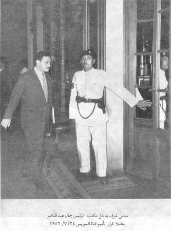 وعلى مسرح الأحداث فى مصر كان الرئيس جمال عبد الناصر ـ قبل صدور قرار التأميم ـ قد اجتمع مع على صبرى ثم استدعانى وبعدها استدعى كمال رفعت فكمال الحناوى كل على حدة ، وأعطى كل منا تكليفا واحدا هو القيام بعمل تقدير للموقف حول ما يمكن أن يترتب على قرار التأميم وما هى الاحتمالات المتوقعة ، وطلب أن يقدم كل منا تقديره منفصلا دون التنسيق مع الآخر فيما عدا سامى شرف وكمال الحناوى فقد أعدا تقريرا موحدا باعتبار أن سكرتارية المعلومات والسكرتارية الصحفية يعملان فى مكتب واحد .